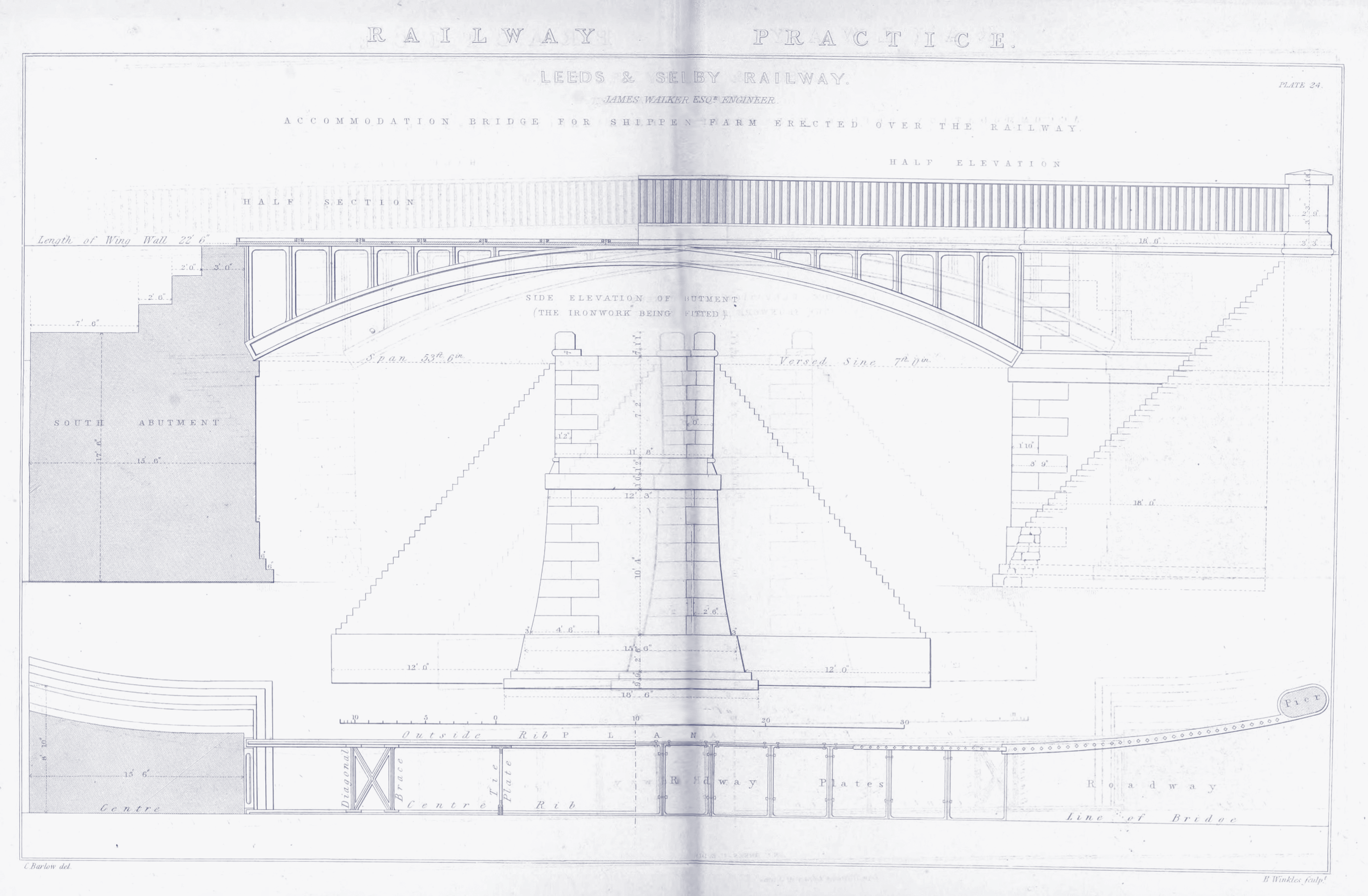 James WalkerThe bridge was designed as part of the Leeds & Selby Railway by engineer James Walker, consulting engineer for the railway, and was built by Stanningley Ironworks in Pudsey, who went on to construct two further bridges on the Transpennine main line between Leeds and Huddersfield, over the River Calder and the Calder & Hebble Navigation canal between Dewsbury and Ravensthorpe. He was also responsible for building 22 lighthouses and several harbours, as well as being involved in the Liverpool and Manchester Railway, which opened just before the Leeds & Selby Railway in 1830. He formed a partnership with his pupil Alfred Burges, and the firm became known as the great nursery of civil engineers in England. He died in 1862 at the age of 81 and is buried in his family vault in Edinburgh. |