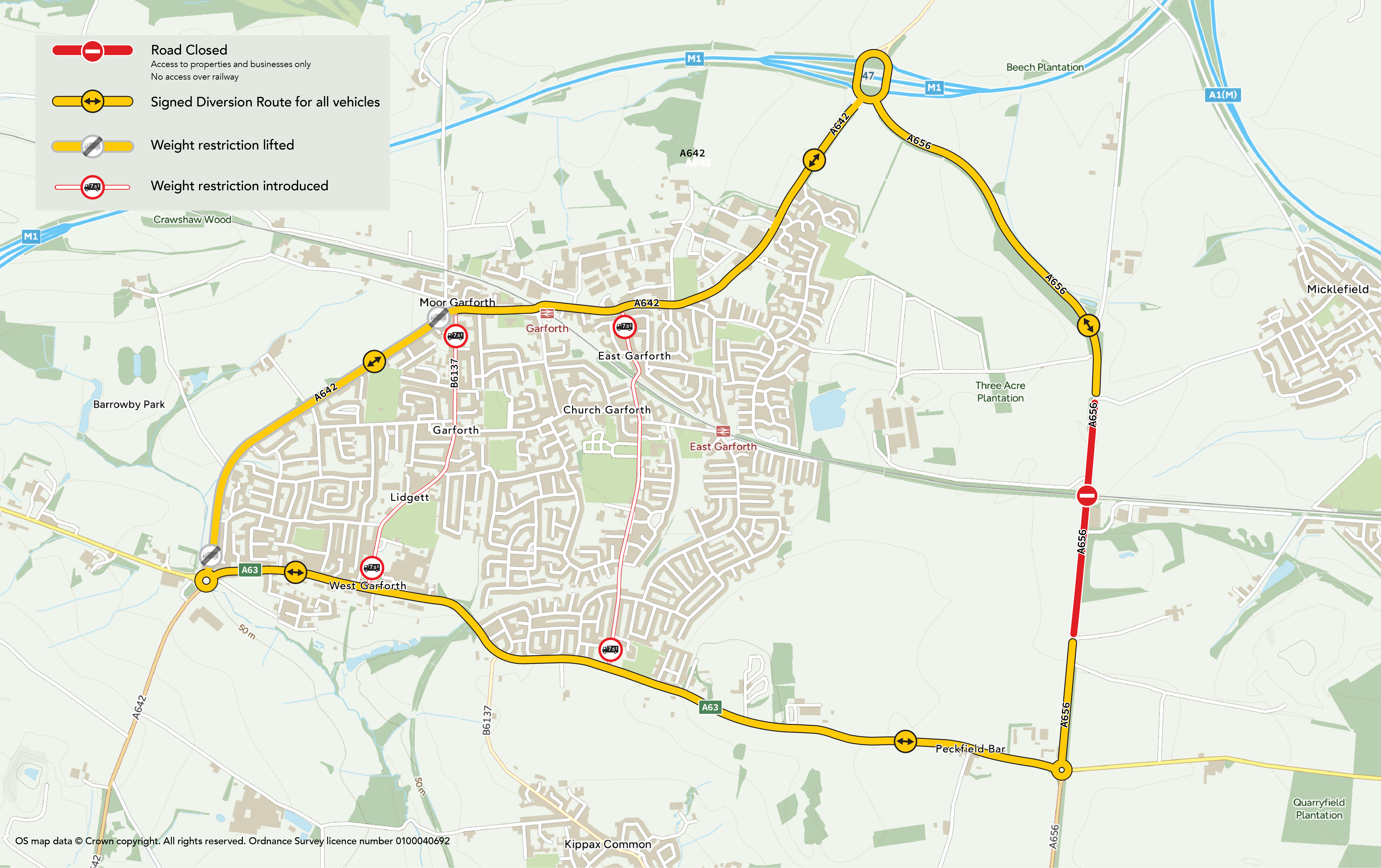 Traffic will be diverted via the A63 and A642 along a clearly signposted diversionary route, shown below:
